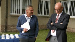 Mit dieser Summe, den 90.000 € Sportfördersumme der Stadt Halle und dem Eigenanteil des Vereins, der knapp 100.000 € mit teils spektakulären Aktionen zusammen sammelte, wird es noch in diesem Jahr zum Spatenstich des hoch ambitionierten Projekts kommen. Der stellvertretende Vereinsvorsitzende Peter Reinke und Fußballabteilungsleiter Dr. Daniel Wurbs erläuterten zu Beginn der Veranstaltung umfassend die Bedeutung dieser Investition für den Traditionsverein, der im Jahr 1952 die einzige Fußballmeisterschale in die Saalestadt holte und aktuell mit 15 Nachwuchs- und Männerteams an die Kapazitätsgrenzen der infrastrukturellen Trainings-und Spielmöglichkeiten stößt. Dem Minister sowie den anwesenden Ehrengästen und Projektförderern wurden als Erinnerung an diesen, für den Verein hochemotionalen Termin, Trikots sowie „70 Jahre Schotter im Marmeladenglas“ als kleine Souvenirs überreicht.
