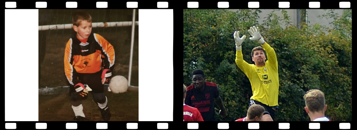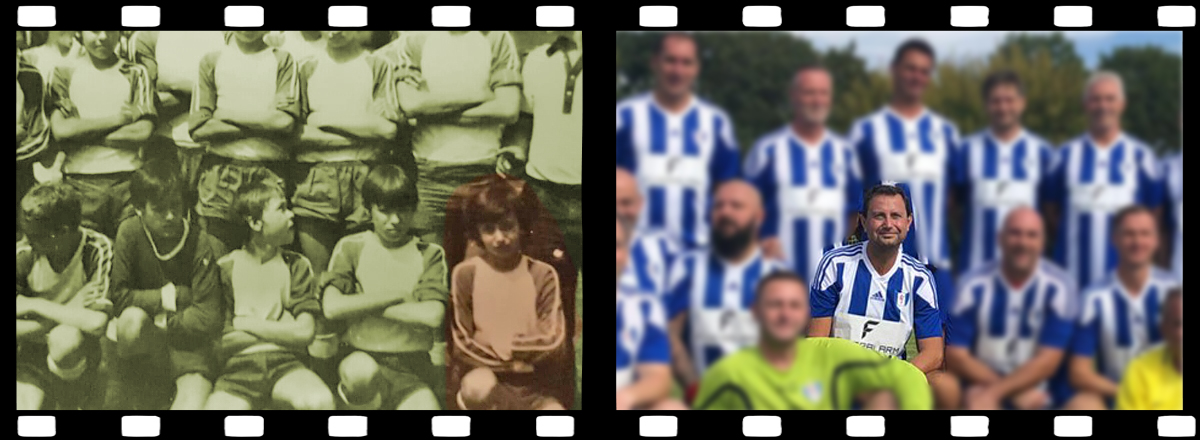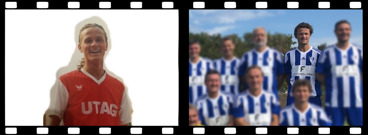 Manch einem wäre der Ball schon längst weggekullert. Micha Borst aber hält gekonnt vor 18 Jahren den Ball unter der Sohle und unter Kontrolle. Muss er wohl auch, denn in dieser staubigen Turnhalle möchte kaum einer das Leder in der Ecke suchen müssen. Im Jahr 2019 posiert er auf dem neuen Kunstrasen schmuck in weiß (rechts). Den Sportsfreund links ignorieren wir mal kurz ... es sei denn, er schickt auch noch ein Foto ein.