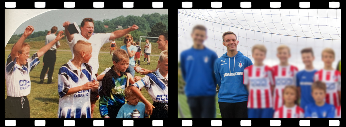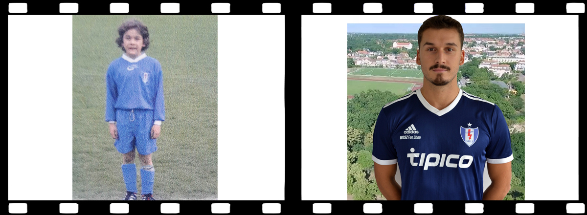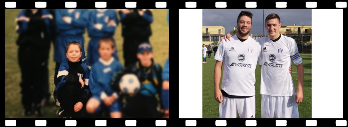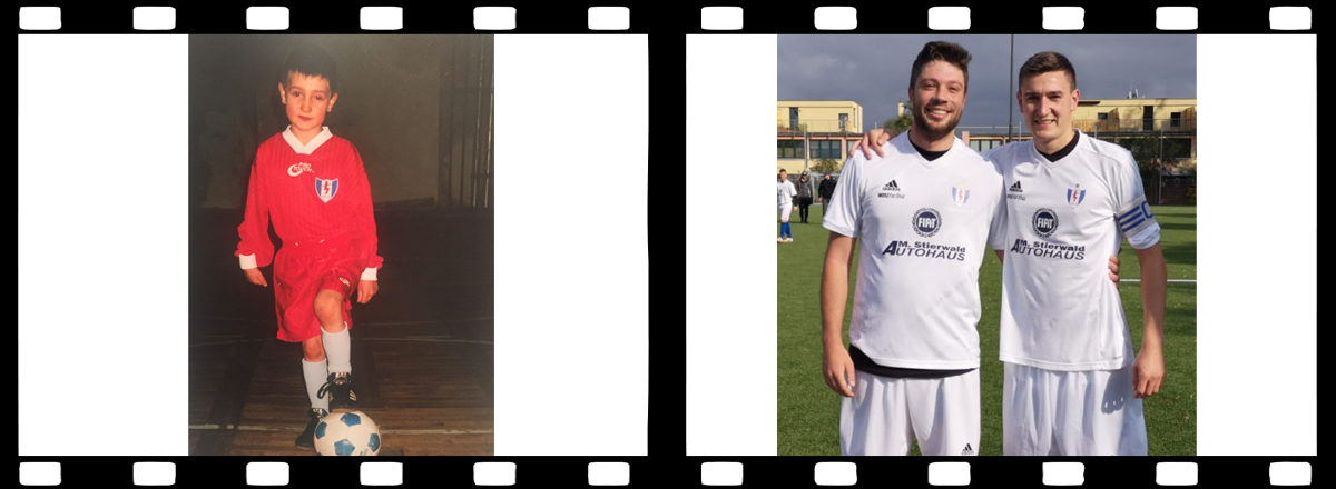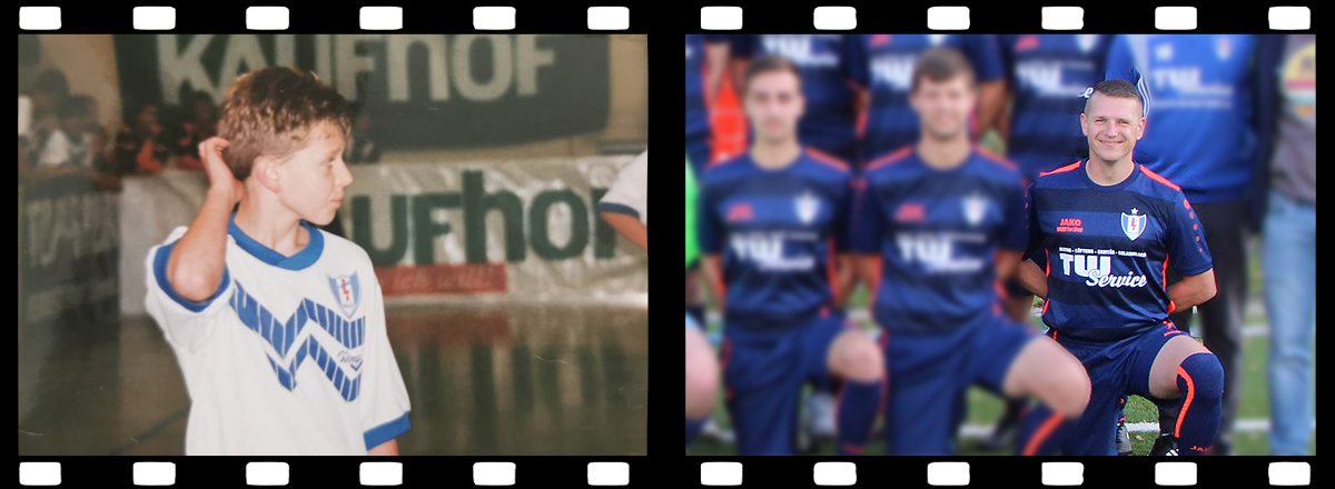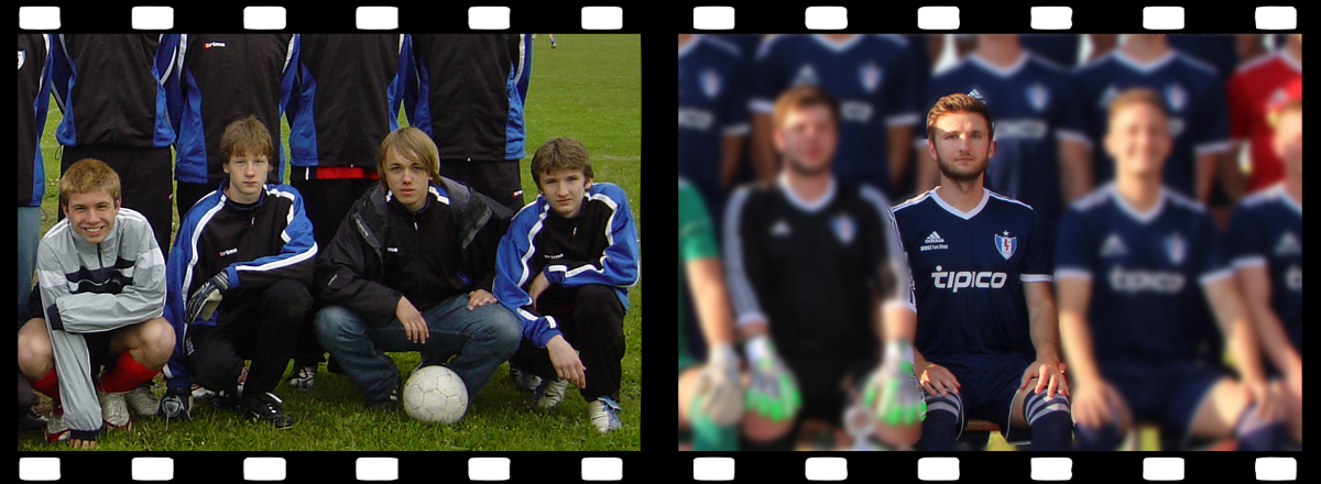Etwas verunsichert wirkt der Griff ins kurze Haar, den Felix Martinowski im jungen Alter von 12 Jahren im Turbine-Trikot präsentiert. Vielleicht war auch die schiere Übermacht der Bundesligateams beim Opel-Mundt-Cup etwas aufregend. Mit etwas höherem Haaransatz heute, dafür aber mit breitem und selbstbewusstem Lächln präsentiert sich Felix in der Gegenwart mit unserer 2.Mannschaft.
