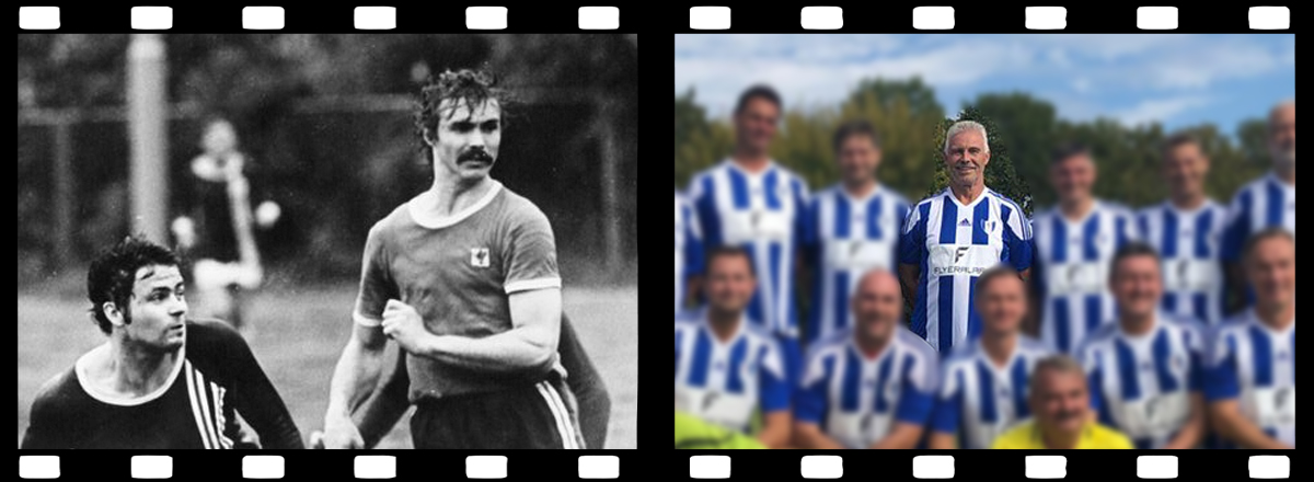 Wenn einer das Prädikat "Nicht alternd" verdient hat, dann wohl unser Hayo. Verändert hat sich eigentlich nur die Kurzhaarfrisur, die er heute - gerne auch unter Ringelmütze - bei den Turbine-Oldies zur Schau trägt. Damals 18-jährig im roten Trikot von Turbine war lange Mähne Trumpf.