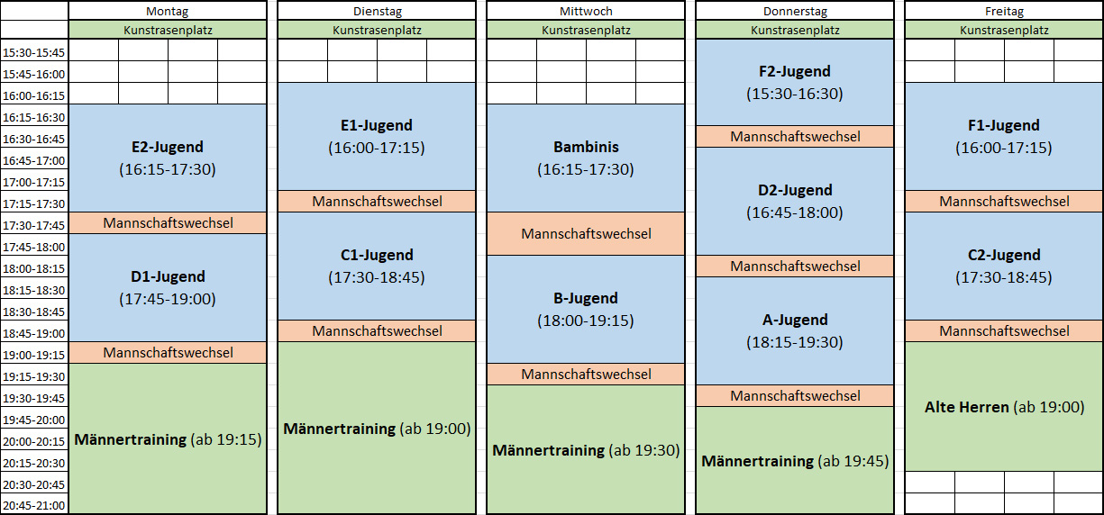 - Bestehen Nachwuchsgruppen aus mehr als 10 Personen, müssen sie das gesamte Großfeld belegen und weitere Trainingsgruppen sind nicht zulässig