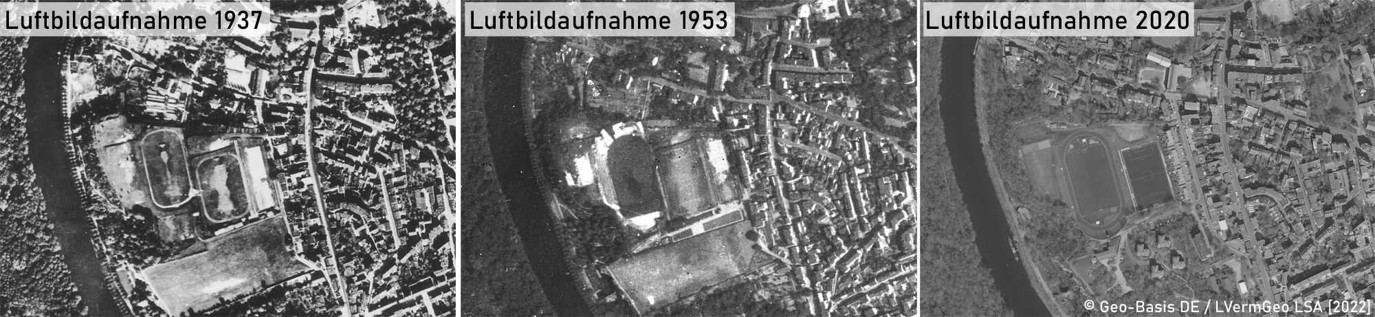 Vor einem Jahr musste die Geschichte des Felsens neu geschrieben werden, als historische Luftbilder belegten, dass bereits 1937 der Hauptplatz mit Laufbahn existierte und auf dem Felsen schon vor über 80 Jahren großflächig gekickt wurde. Jetzt hat das Landesamt für Vermessung und Geoinformation Sachsen-Anhalt noch einmal nachgelegt und Luftbilder aus den Jahren 1952 und 1953 veröffentlicht. Genau in diese Zeit fiel der Bau des damaligen Stadions.