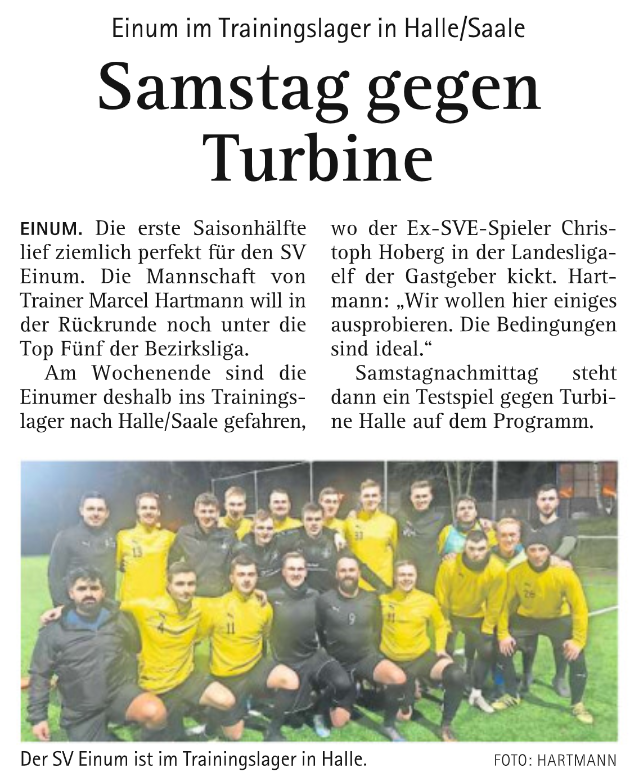 Von Freitag- bis Samstagabend weilte der niedersächsische Bezirksligist SV Einum zu einem Kurztrainingslager auf dem Felsen. Der Heimatverein unseres Spielers Christoph Hoberg absolvierte zwei Trainingseinheiten auf dem Kunstrasenplatz und nutzte die guten Bedingungen für die eigene Vorbereitung auf die Rückrunde. Am Samstagnachmittag trafen Turbine und Einum in einem Freundschaftsspiel aufeinander und trennten sich 2:2. Den Abschluss bildete ein gemeinsames Mannschaftsessen.