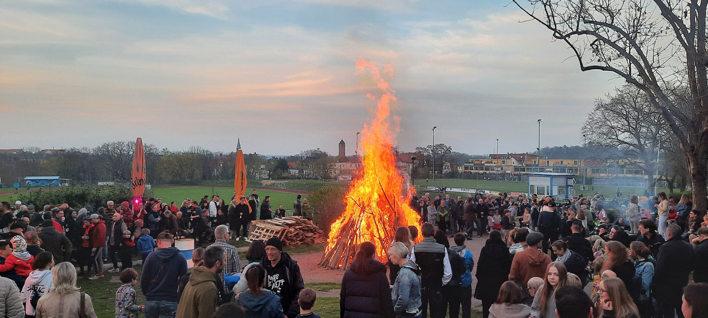 Wenn frühlingshaftes Wetter und Publikum zueinander finden, dann ist meistens Osterfeuerzeit im Kiez. Auch in diesem Jahr ließen es sich geschätzt 400 Gäste nicht nehmen, den Ostersonntag auf dem Felsen ausklingen zu lassen und der Entzündung des höchstgelegenen Osterfeuers des Giebichensteinviertels beiuzuwohnen. Stundenlang wurde bei Würstchen vom Grill, Knüppelkuchen, kühlen Getränken und Musik geplaudert, gechillt und getanzt.