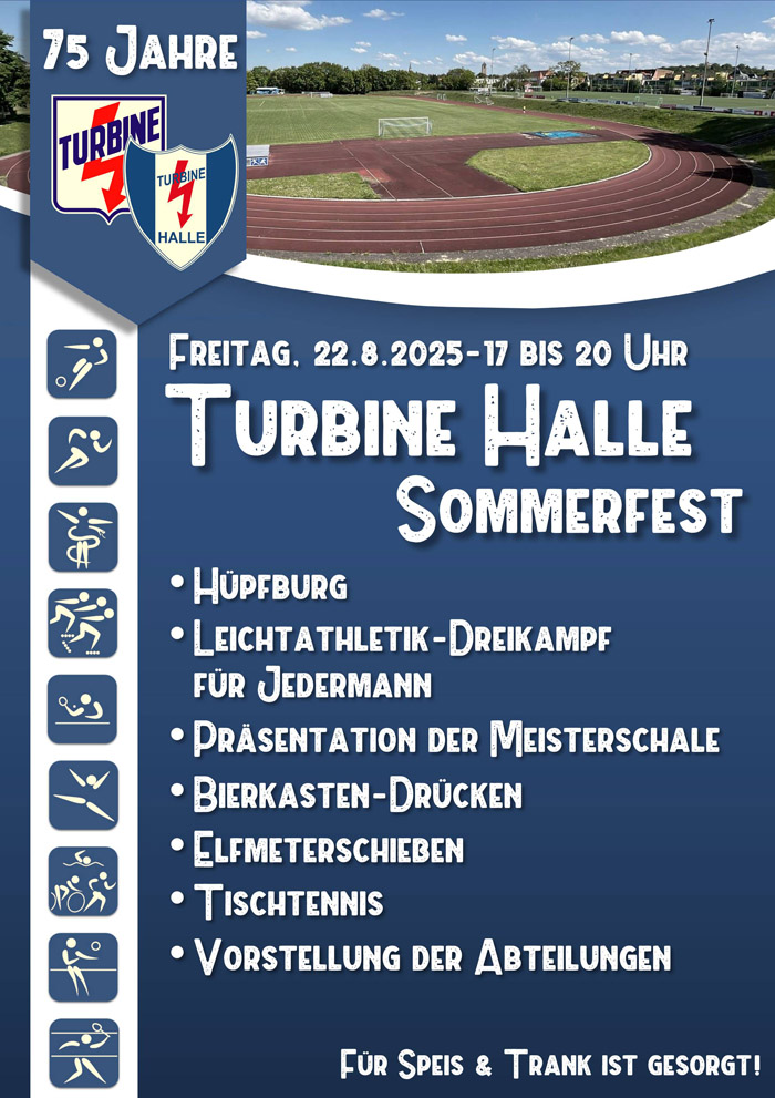 Unter dem Motto "Klein aber fein" findet am Freitagabend, den 22.August von 17 bis 20 Uhr das Sommerfest des Gesamtvereins und der Abteilungen zum 75-jährigen Vereinsjubiläum auf dem Felsen statt. Hierzu lädt der Gesamtverein alle Vereinsmitglieder, Familien, Freunde und Gäste herzlich ein. Für Groß und Klein, zum Mitmachen, Zuschauen oder Kennenlernen der Abteilungen ist etwas dabei. Lasst uns ein paar schöne gemeinsame Stunden auf dem Turbine-Sportplatz haben.