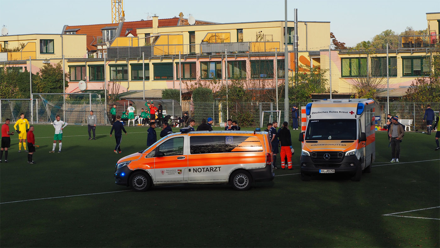 Wenn Fußball zur Nebensache wird ... In der 5.Minute des Landesligaspiels zwischen Turbine und dem 1.FC Zeitz kommt es zu einem derart heftigen Zusammenprall, dass es nach 30-minütiger Spielunterbrechung nur noch heißen kann: Spielabbruch. Bevor die Rettungskräfte rasend schnell eintrafen, leisteten die Kicker und Betreuer Erste Hilfe. Ein riesengroßes Dankeschön geht vor allem an Khemgin Solivani vom 1.FC Zeitz, der durch seinen Einsatz ..